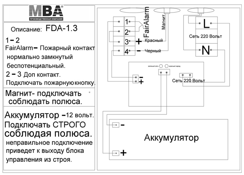 Схема подключения блока управления противопожарными воротами FDA 1.3