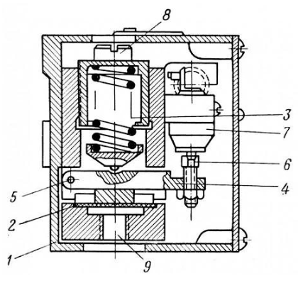 Реле давления состоит из корпуса 1, диафрагмы 2, пружины 3, рычага 4 с осью 5, винта 6, микропереключателя 7. Рабочая жидкость на контролируемой ветви гидросистемы подводится к отверстию 9. Если подведенное давление окажется выше установленного настройкой пружины 3, то диафрагма 2 деформируется и передает давление на рычаг 4, который при повороте вокруг оси 5 винтом 6 воздействует на микропереключатель 7.