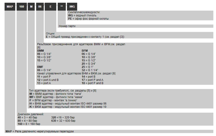 Реле давления MAP-040, MAP-080, MAP-160, MAP-320 и MAP-630 управляет электрической цепью, замыкая или размыкая контакты при достижении установленного давления в гидросистеме.