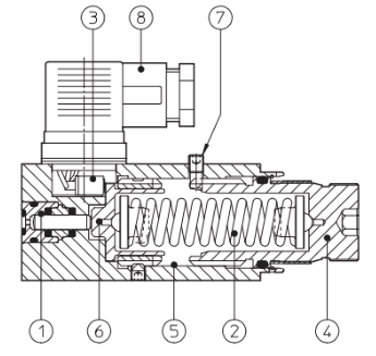 Когда давление жидкости воздействует на поршень (1), который соединен с регулировочной пружиной (2), поршень активирует микровыключатель (3), замыкая или размыкая электрические контакты, как только заданное давление достигнуто.