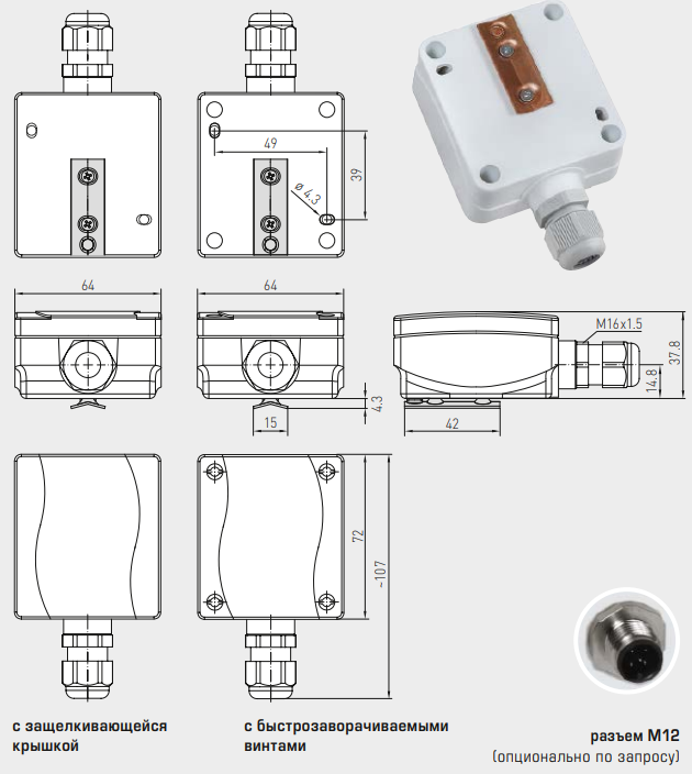 Подсоединение кабеля: | резьбовой кабельный ввод из пластика (M16 x 1,5; с разгрузкой от натяжения, сменный, макс. внутренний диаметр 10,4 мм) или разъем M12 (опционально по запросу) |