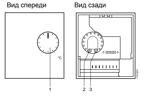 В корпусе размещен термочувствительный элемент и, в зависимости от типа один или с ручкой задания уставки и рабочие элементы. На основной плате расположены клеммы.