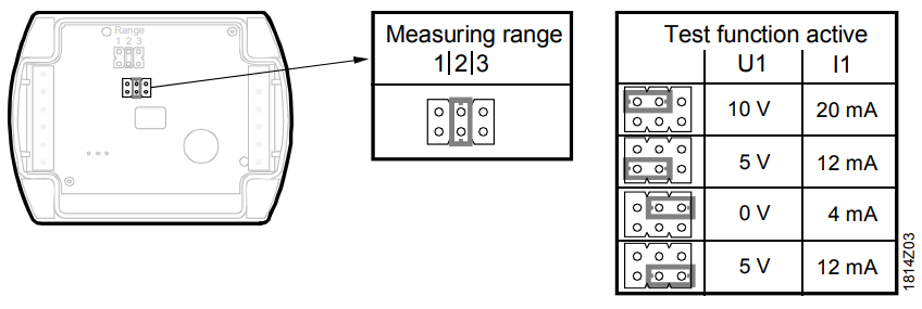 Элементы задания параметров расположены внутри корпуса, и состоят из 6 штырьков и перемычки. Они используются для задания диапазона измерения и для активации функций тестирования.