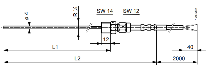 Резьбовая втулка с ниппелем R ¼ (с уплотнением на резьбе) используется для монтажа датчика на трубу. Погружной стержень изолируется от соединительных кабелей сверху усадочной муфтой длиной 30 мм.