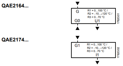- U1 Выход DC 0...10 V для диапазона измерения −10...+120 °C (заводская установка), 0...100 °C или 0...70 °C.