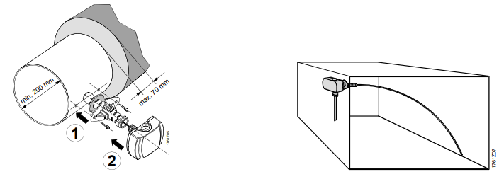 После закрепления монтажного фланца датчик устанавливается в 6 различных погружным положениях так, что корпус датчика должен всегда выступать за край изоляционного слоя на не менее 70 мм. Пробник длиной в пределах 2 - 6 м закрепляется на воздуховоде крепежным зажимом, поставляемых вместе с датчиком