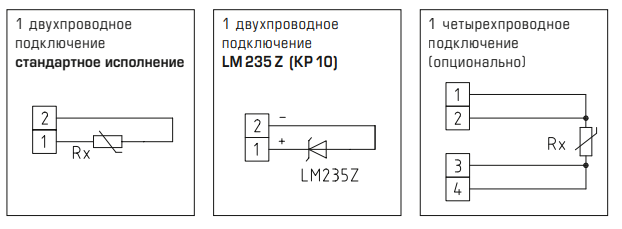Тип подключения: | по двухпроводной схеме (четырехпроводное подключение для PT100 / PT1000A, для других датчиков — опционально) |