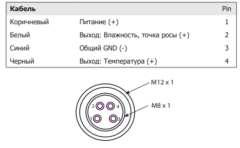 Датчик имеет два аналоговых выхода и способен передавать значения температуры и относительной влажности, влагосодержания или точки росы.