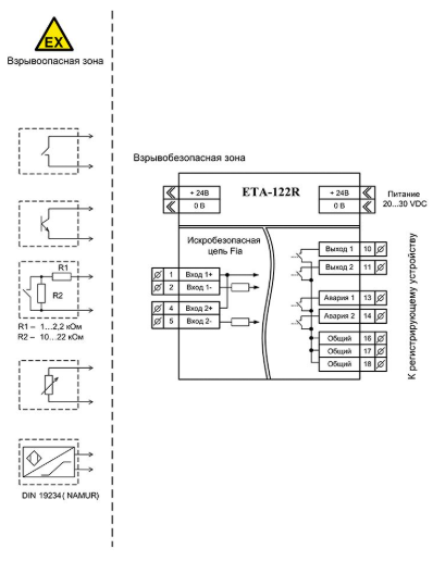 Вход поддерживает сигналы стандарта NAMUR с контролем целостности цепи или тип «сухой контакт» и обеспечивает искрозащиту уровня [Ex ia Ga] IIC X. Выход ЕТА-122R формирует контакты реле, а ЕТА-122C — контакты типа «сухой контакт», включая основной сигнал и сигнал «Авария».
