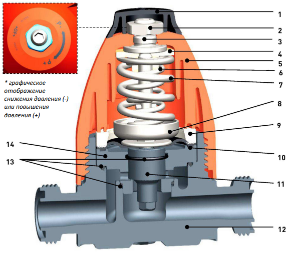 - Диапазон настройки давления: 0,5...9,0 бар (по запросу 0,3...3,0);