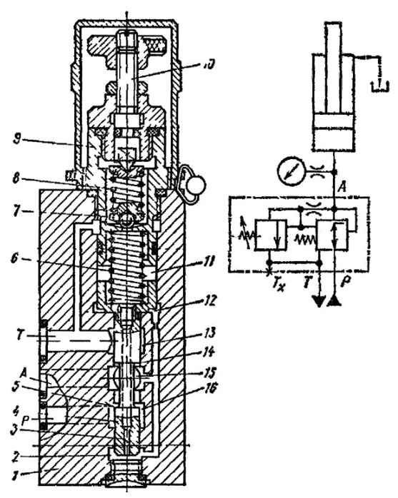 Регуляторы давления ПГ57-6 (см. рисунок ниже) содержат корпус 1, двухкромочный переливной золотник 4, вспомогательный клапан 7, крышку 9, пружины 6, 8 и регулировочный винт 10 Масло из напорной линии Р подводится в полость 16 и далее через щель между корпусом и кромкой 5 поступает в полость 15, соединенную с уравновешивающим цилиндром линией А. Полость 15 каналами в корпусе соединена с нижними торцовыми полостями 2 и 12 золотника 4 и через малое отверстие 3 в золотнике — с верхней торцовой полостью 11, откуда масло через клапан 7 может поступать в полость 13, соединенную со сливной линией Т.
