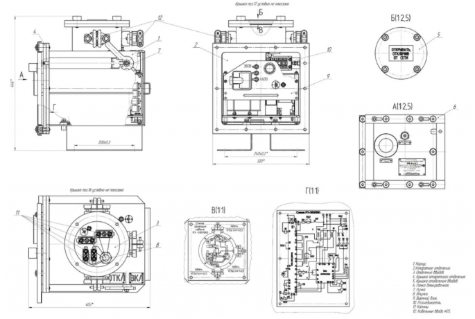В аппаратном отделении размещены выемной блок, разъединитель и внутренний заземляющий зажим. В отделении вводов находятся три кабельных ввода, клеммы для подключения проводов и заземляющий зажим. Оба отделения защищены крышками. Для повышения безопасности крышка аппаратного отделения снабжена блокировкой, исключающей возможность ее открытия при включенном разъединителе. Устройство дополнительно оснащено наружным заземляющим зажимом. Герметичность кабельных вводов обеспечивается резиновым уплотнительным кольцом.