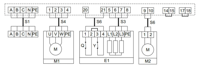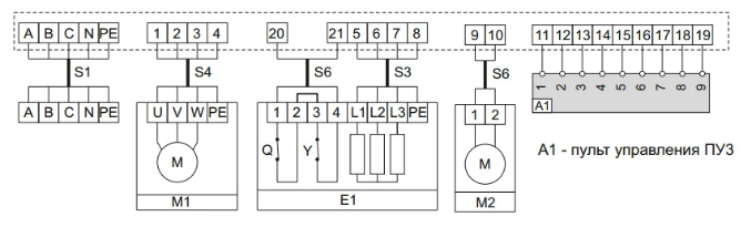 - M1 — приточный вентилятор мощностью до 7,5 кВт , питание 380 В;