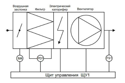 - М1 - приточный трехфазный вентилятор, питание 380 В;