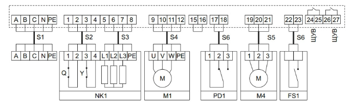 - М4 - привод вентиляционной заслонки, питание 220 В, трехпроводное управление;