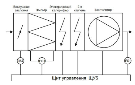 - М4 - привод вентиляционной заслонки, питание 220 В, трехпроводное управление;