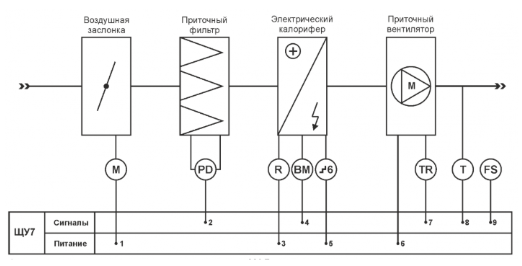 Щит управления ЩУ7 предназначен для автоматизации и управления работой вентилятора и электрического калорифера в приточной вентиляционной системе. Возможно подключение частотного преобразователя для регулировки скорости вентилятора.