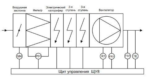 Щит управления ЩУ8 предназначен для автоматизации работы вентилятора и электрического калорифера в составе приточной вентиляционной установки.