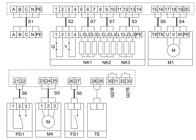 - А В С - сеть, N - рабочая нейтраль, PE - защитная земля;