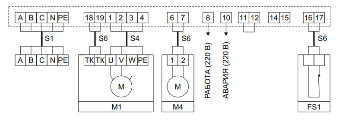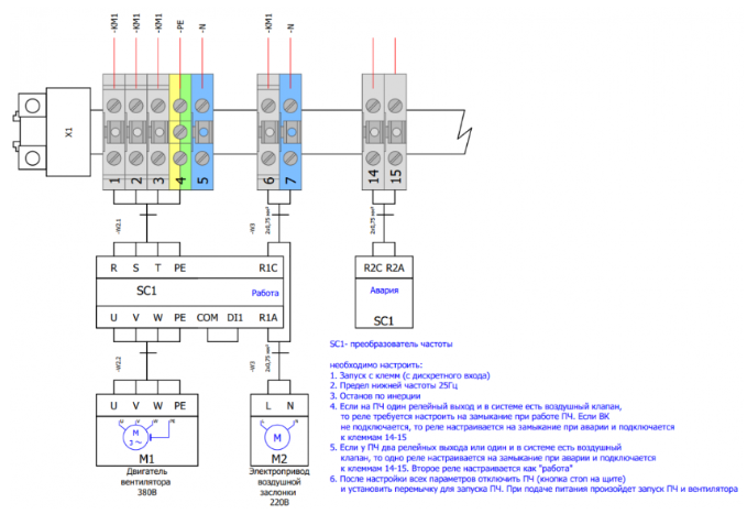 - М1 - вентилятор, питание 220 В, щит управления подбирается по рабочему току двигателя вентилятора, реле защиты ТР220 переводится в режим ВМ, а между контактами 18 и 19 устанавливается перемычка.