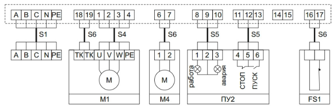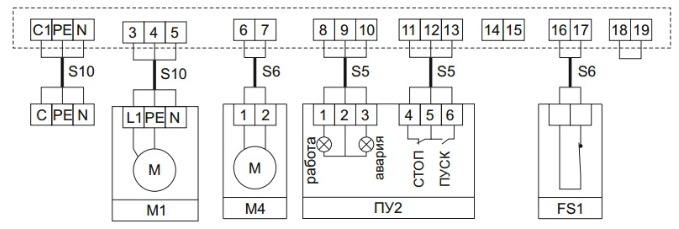 Схема подключения ЩУВ1, пуск/стоп вентилятора с пульта управления ПУ2