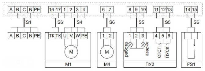Схема подключения ЩУВ4, пуск/стоп вентилятора кнопками щита управления