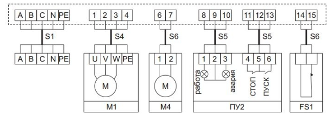 Схема подключения ЩУВ5, пуск/стоп вентилятора с пульта управления ПУ2