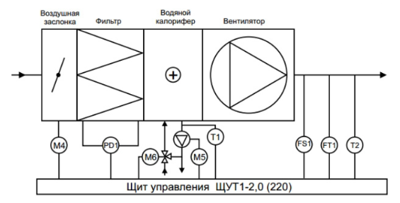 Щит управления ЩУТ1-2,0 (220) осуществляет регулирование температуры приточного воздуха и защиту теплоносителя водяного калорифера NW1 от замерзания.