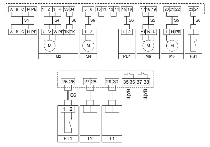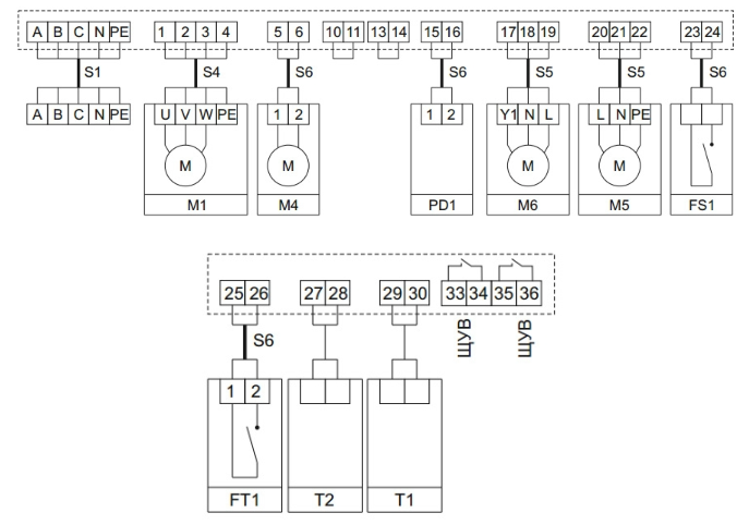 При подключении вентилятора с трёхфазным двигателем на 380 В реализована защита от перегрева или перегрузки двигателя по току. ЩУТ3 может работать в связке с управляющими шкафами серий ЩУВ1, ЩУВ2 или ЩУВ3, что позволяет дополнительно управлять вытяжным вентилятором, синхронизируя его запуск с приточным.