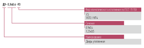 - ДУ 0,9х0,4-У3 – дверь утепленная для вентиляционной камеры с сечением 900х400 мм для районов с умеренным климатом 3-й категории размещения.