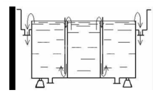 Трехкамерные двухкаскадные. Среднее отделение ванны постоянно очищается от всплывающих загрязнителей.
