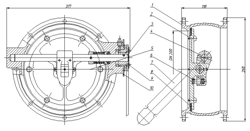 - Корпус. Через него, при открытой заслонке, в клапане герметическом с ручным приводом (тип КГ) – гермоклапане КГ-200 проходит воздушная среда;