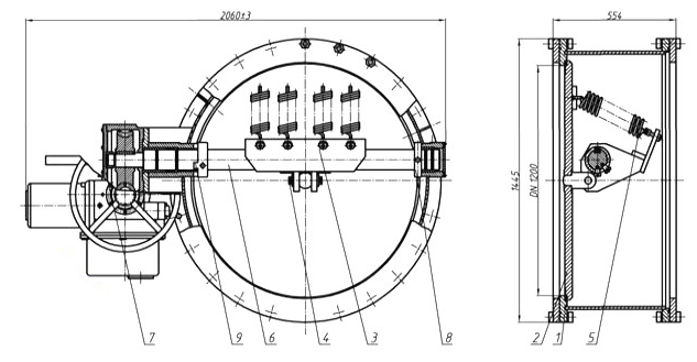 В процессе открытия клапана герметического вентиляционного (тип ГК ИА) – гермоклапана ГК ИА 01009-1200 электропривод подает вращение на вал 6, соединенного с тарелью 2. В начале поворота вала на 20°-30° тарель отсоединяется от седла корпуса клапана герметического вентиляционного (тип ГК ИА) – гермоклапана ГК ИА 01009-1200, проворачиваясь, что достигается с помощью трех пружин 5.