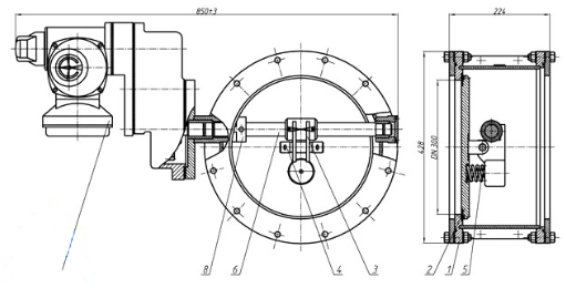В процессе открытия клапана герметического вентиляционного (тип ГК ИА) – гермоклапана ГК ИА 01009-300 электропривод подает вращение на вал 6, соединенный с тарелью 2. В начале поворота вала на 20°-30° тарель отсоединяется от седла корпуса клапана герметического вентиляционного (тип ГК ИА) – гермоклапана ГК ИА 01009-300, проворачиваясь, что достигается с помощью пружины 5.