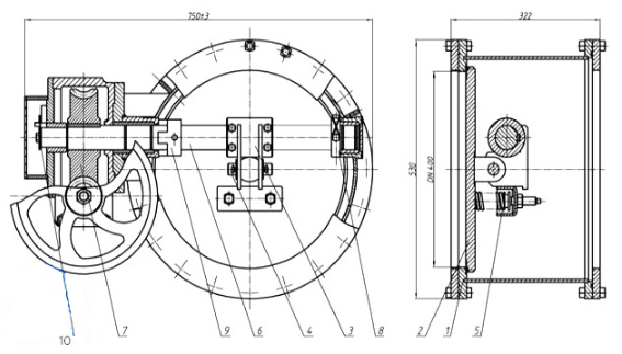 Ограничителем движения заслонки в процессе открытия, служит заштифтованный на валу клапана герметического вентиляционного (тип ГК ИА) – гермоклапана ГК ИА 01010-400 ограничитель 9, который упирается в выступ на корпусе. Состояние клапана «открыто» или «закрыто» сообщается посредством указателя 10.