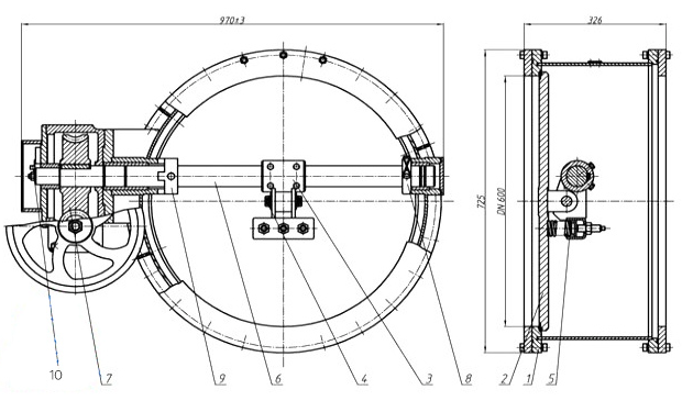 - при дальнейшем вращении вала на 90° тарель вместе с рычагом 3 также поворачивается и занимает положение, перпендикулярное посадочной части клапана герметического вентиляционного (тип ГК ИА) – гермоклапана ГК ИА 01010-600 и параллельном оси воздуховода, обеспечивая свободное прохождение воздушной среды.