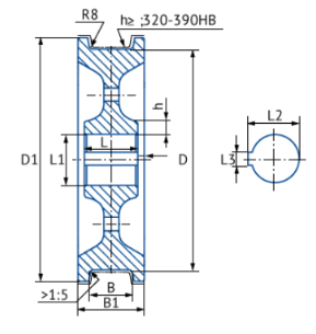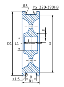 Условное обозначение | D, Диаметр поверхности катания, мм | D1, Диаметр колеса, мм | B, Ширина поверхности катания, мм | B1, Ширина обода, мм | L, Ширина ступицы, мм | L1, Диаметр посадочного отверстия, мм | L2,L3, Размеры шпоночного паза, мм | Масса двухребордного кранового колеса, кг |
