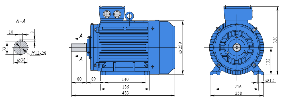 - 132 - габарит двигателя (расстояние от оси вращения до плоскости крепления: 132 мм);