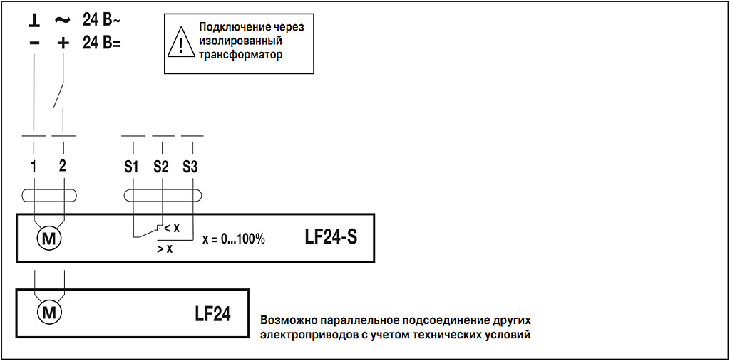 0…100 %, при помощи встроенного вспомогательного переключателя (только LF24-S).