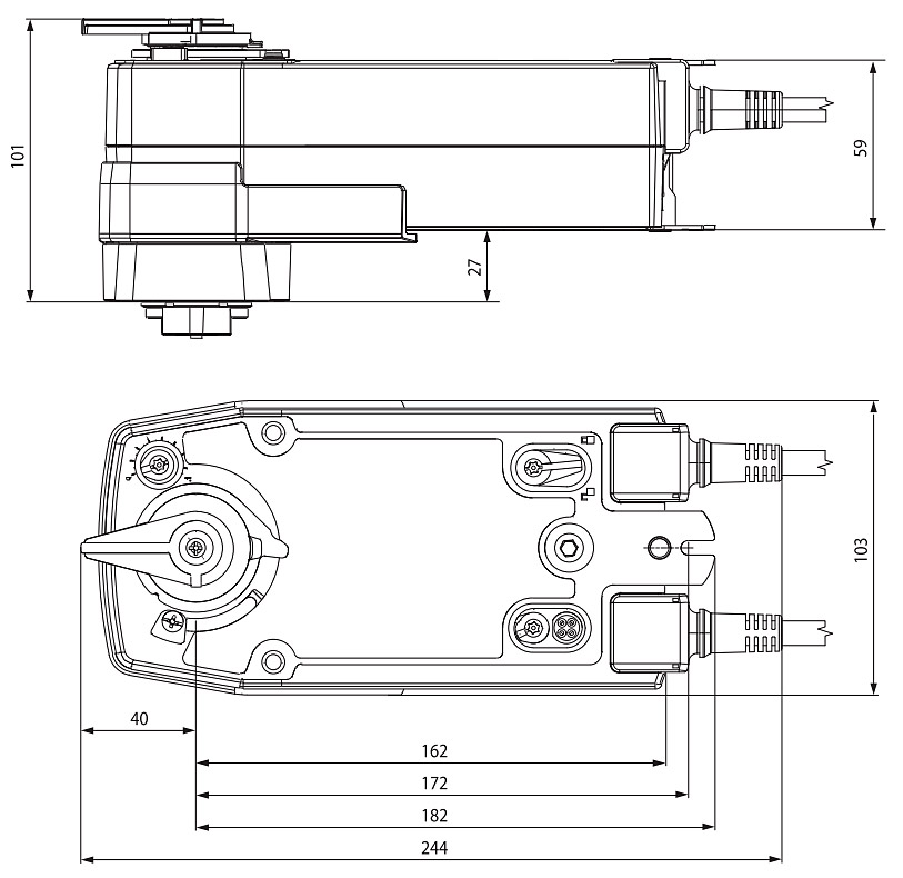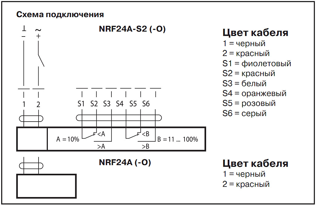 Электроприводы NRF…S2 оснащены одним фиксированным 10% вспомогательным переключателем и одним настраиваемым 11…100% переключателем.