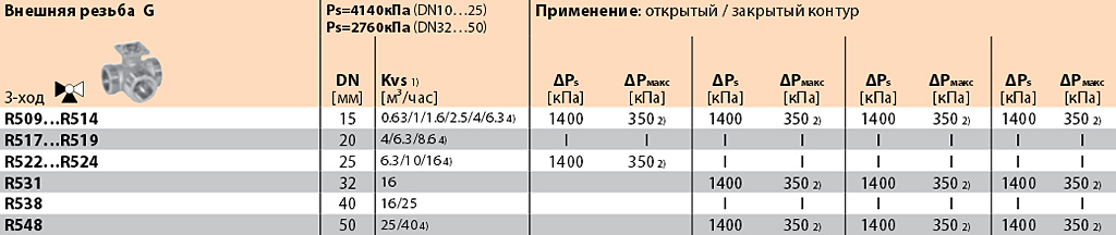 ТИП | Kvs [м³/час] | DN [мм] | Rp [дюймы] | Ps [кПа] |