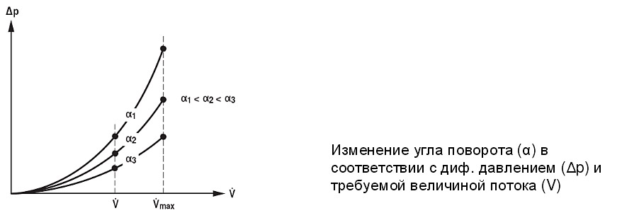 Электропривод состоит из 3-х частей: регулирующий клапан с корректирующим диском, измерительная труба с датчиком скорости среды и самого привода. Прежде всего, на электроприводе задается максимальный расход Vmax, значение которого должно находиться в пределах от 30% до 100% от максимально возможного расхода Vnom. В то же время, значение Vmax соответствует максимальному значению управляющего сигнала (как правило, 10 В). В связи с тем, что регулирующий клапан имеет равнопроцентную характеристику потока, управляющий сигнал для расхода также отображается в равных процентах, например, 70% управляющего сигнала соответствует 38% значения Vmax. В случаях общепринятого применения, электропривод подключается к стандартному сигналу 0.5...10 В=. Потоки среды, протекающие в измерительной трубе со скоростью от > до 2 м/с определяются датчиком как значение расхода. Стандартный сигнал в электроприводе сравнивается с измеренной величиной расхода. В зависимости от отклонения, электропривод перемещает шар регулирующего клапана в требуемую позицию и действует как дросселирующее устройство. Положение шара изменяется, в зависимости от дифференциального давления, посредством конечного регулирующего элемента (см. кривую величины потока).