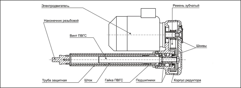 При подаче напряжения ротор электродвигателя через редуктор с зубчато-ременной передачей приводит во вращение винт передачи ПВГС.