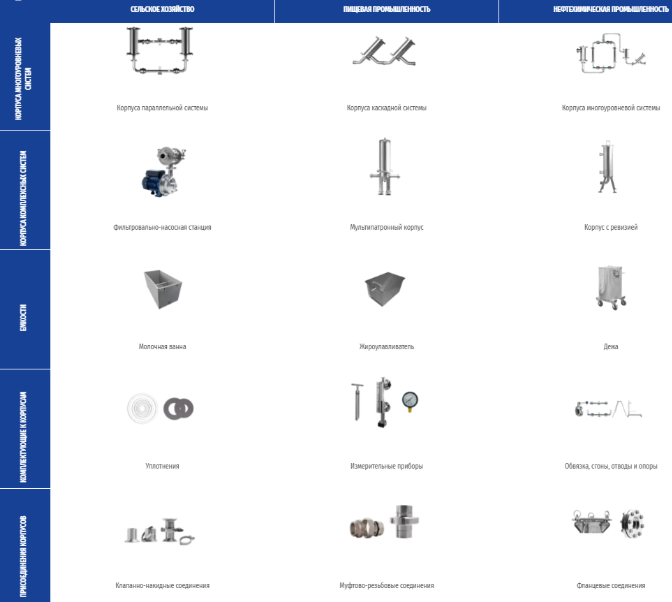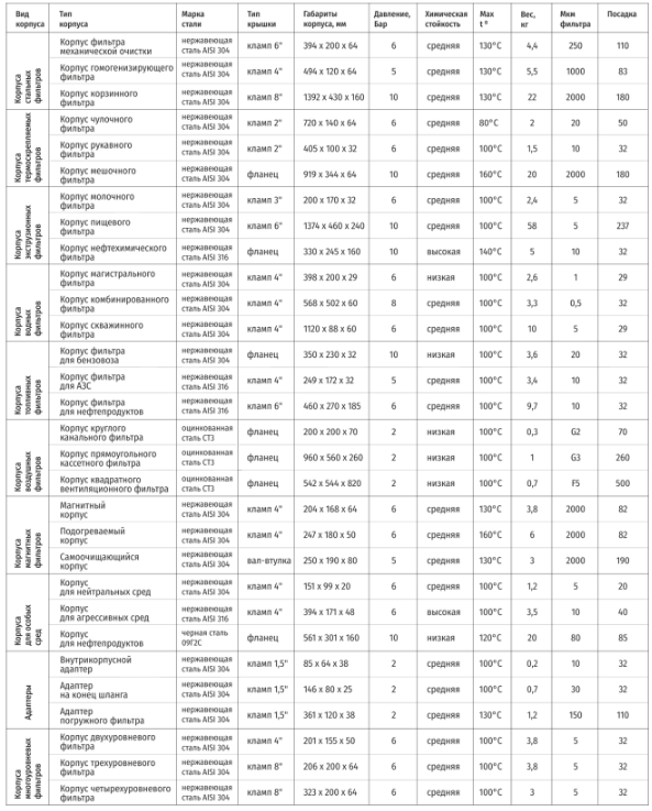 Стандартная комплектация корпусов включает в себя тело корпуса, крышки, комплекты кламповых хомутов или фланцев, уплотнители. Фильтрующие элементы подбираются под конкретную задачу и поставляются дополнительно. По запросу клиентов к стандартной комплектации добавляются: опорнокрепежная система, контрольно-измерительные приборы, дополнительные комплекты уплотнителей. Возможна замена кламповорезьбовых соединений на фланцевые и муфтовые.