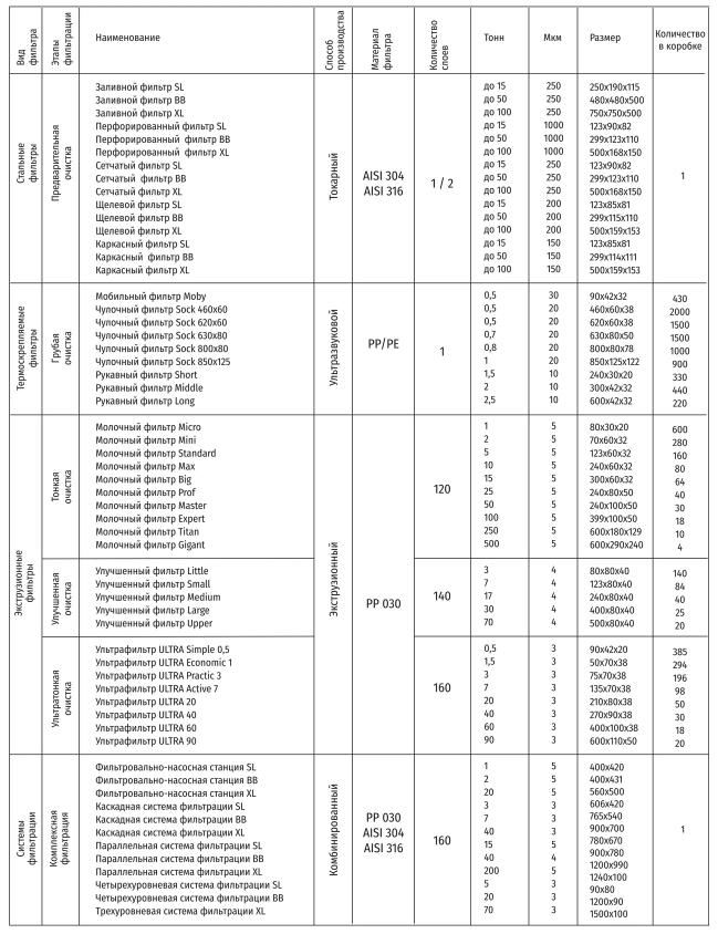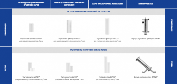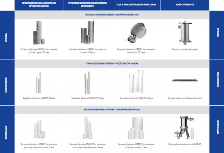 Ассортимент молочных фильтров UVMILK