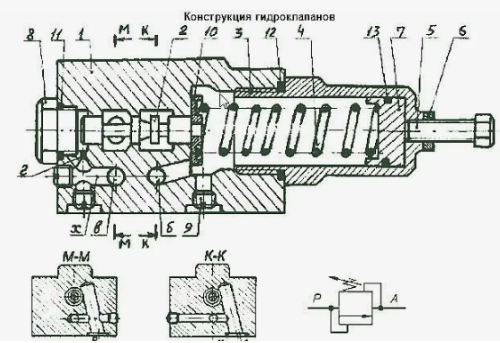 - переливного клапана для поддержания заданного давления путем непрерывного слива рабочей жидкости во время работы.