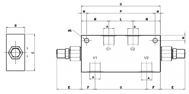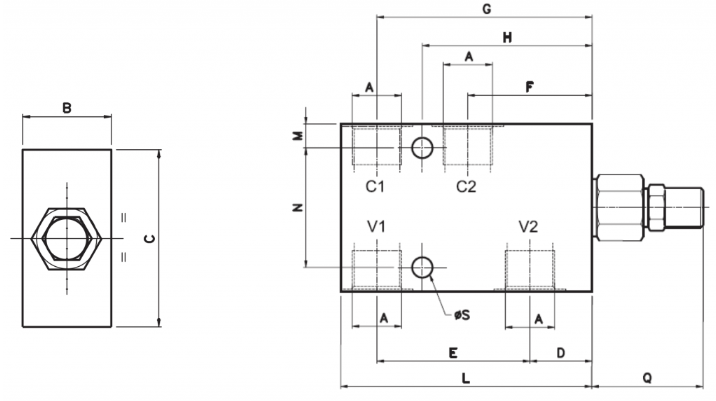 Типоразмер | A | Максимальный расход, л/мин | Максимальное давление, бар | Отношение пилотного давления к основному | B | C | D | E | F | G | H | L | M | N | Q | S | Вес, кг |