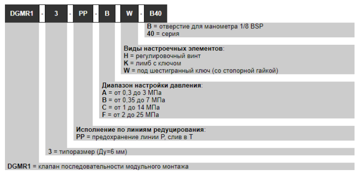 Гидроклапаны моделей DGMR1-3-PP-AW-B40, DGMR1-3-PP-BW-B40, DGMR1-3-PP-CW-B40 и DGMR1-3-PP-FW-B40 представляют собой клапаны последовательности в модульном исполнении с монтажной поверхностью, соответствующей стандартам CETOP 03 (Ду=6 мм) и ISO.
