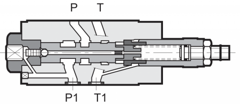 В нормальном состоянии клапан закрыт. Давление в магистрали P1 воздействует на золотник с одной стороны, а с другой стороны на него действует регулировочная пружина. Как только давление в магистрали P1 достигает установленного значения, клапан открывается, позволяя жидкости проходить в контролируемую магистраль (P).
