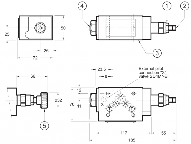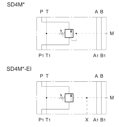 Клапаны SD4M* доступны в двух вариантах: с внутренним и внешним управлением. В случае внешнего управления отверстие управления «X» соответствует монтажной схеме CETOP 4.2-4-R05. Эти клапаны могут быть легко установлены вместе с направляющими клапанами DS5 и DL5B без дополнительных соединительных элементов. Обычно клапан поставляется с регулировочным винтом с внутренней шестигранной головкой, стопорной гайкой и ограничителем максимального хода регулировки.